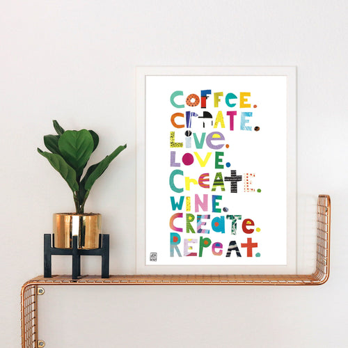 Coffee, Create, Love, Wine, Repeat Collage Print