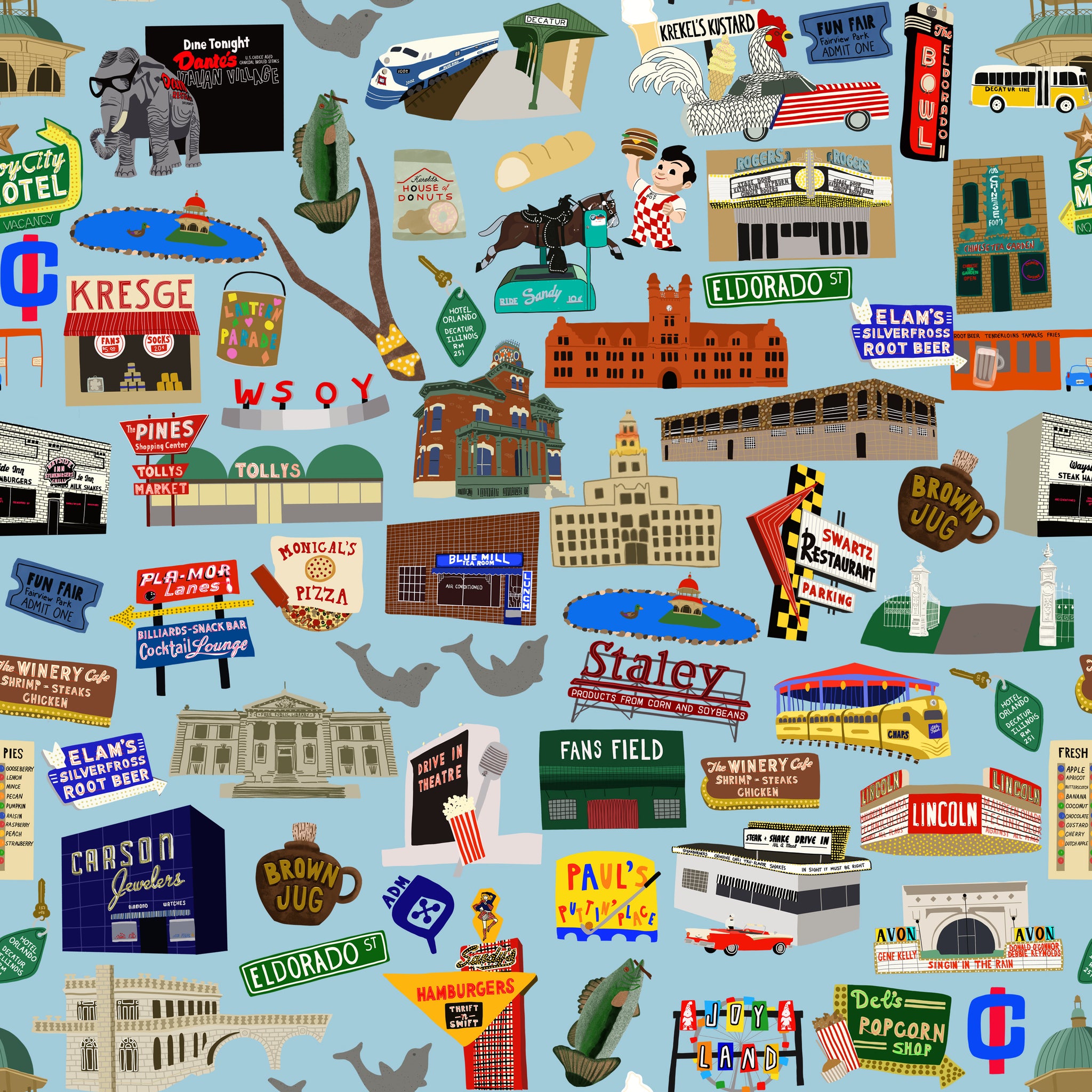 Celebrate the charm of Home Town Decatur, Illinois with this Decatur, Illinois Wrapping Paper. Perfect for adding a playful, nostalgic touch to any gift, it features iconic retro designs that capture the city's nostalgic spirit. Make your presents stand out with a wrap that’s as fun and unforgettable as a night cruising Eldorado.