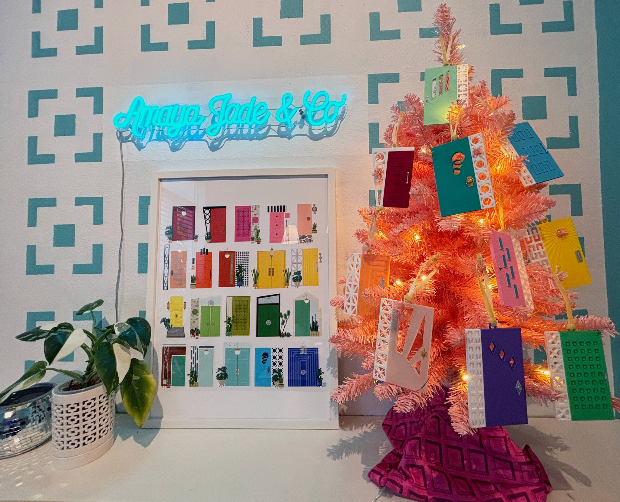 These striking, 3D printed ornaments capture the iconic style of Mid-Century Modern architecture, reimagined as a festive holiday decoration. Inspired by the vibrant, distinctive front doors of MCM homes, each ornament features a bold door color and a distinct style, accented with a gold-tone door handle. The design is finished with a classic white decorative screen on the side, reminiscent of the breeze blocks or geometric panels often seen in period homes.