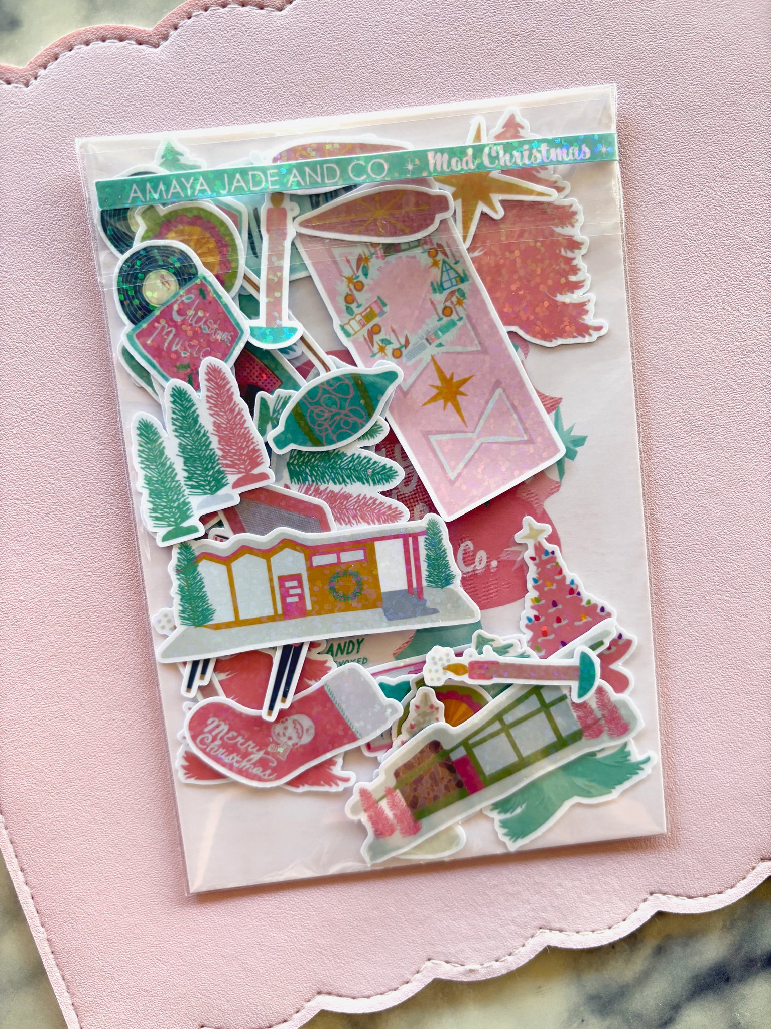 This collection is packed with delightful, throwback designs that capture the best of Atomic Age and Mod holiday style. Each sticker features a vibrant holographic finish that shifts and shimmers, making your holiday crafts, gifts, and decor truly stand out.