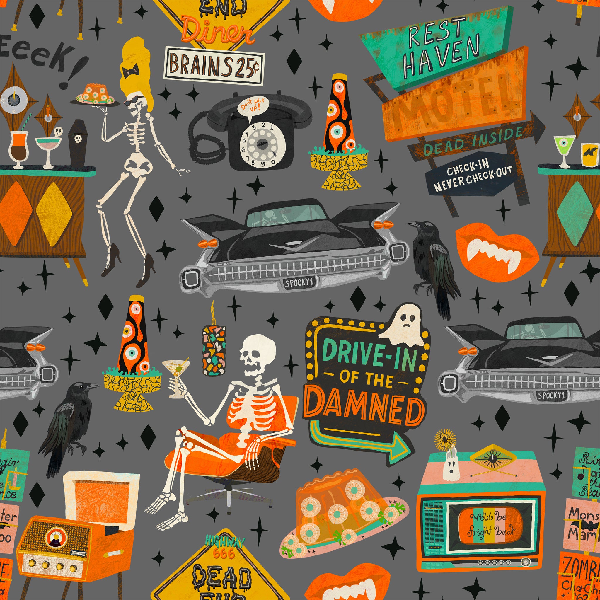 Bring your gifts to life (or… the afterlife) with this Retro Halloween Drive-In Wrapping Paper! Featuring dancing skeletons, haunted finned cars, creepy vintage signs, and kitschy mid-century details, this design is perfect for anyone who loves a good scare with a splash of atomic-era charm. Inspired by 1950s and 60s drive-in culture—with a ghoulish twist—this wrap is ideal for Halloween parties, horror movie marathons, or year-round spooky style.