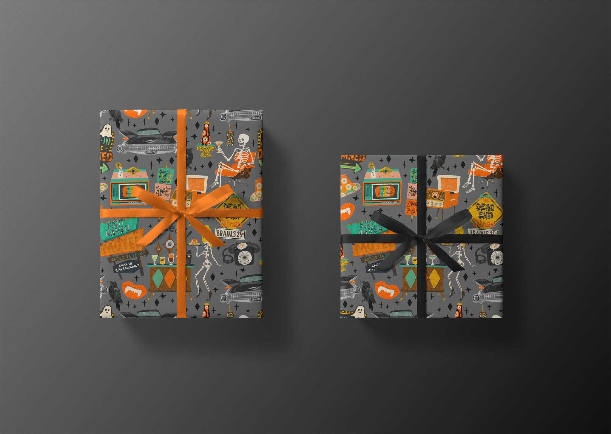 Retro Spooky Wrapping Paper 65 lb featuring my one-of-a-kind original Artwork. Each sheet is 24" x 36". Comes rolled and shipped inside a 2" x 24" shipping tube.
