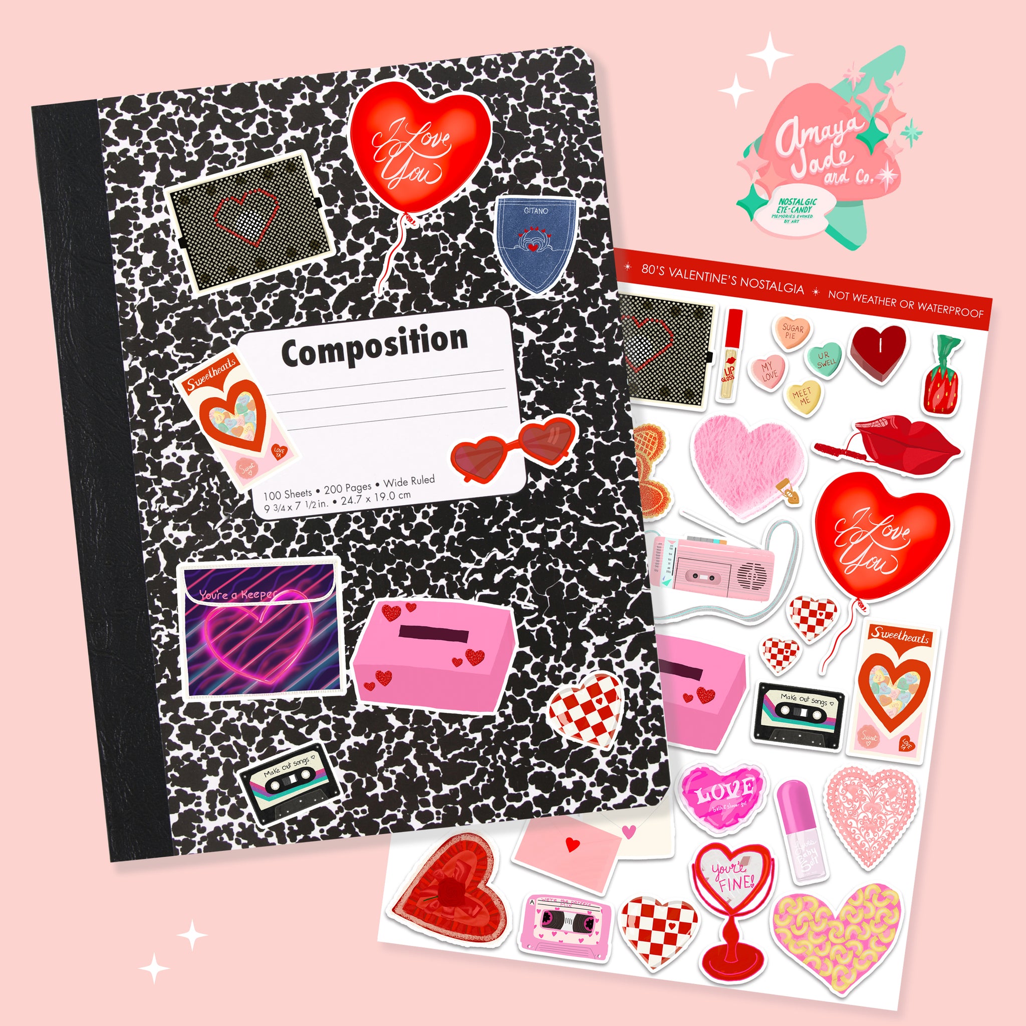 80's Valentine's sticker sheet. This is a set of 36 stickers. Printed on white matte polypropylene. Stickers are individually kiss-cut on an 6 3/4" x 9 1/2" sheet (they are not single-cut stickers for resale purposes, they are on one sheet). Not weather or waterproof, these will NOT hold up on a water bottle, car, etc. Approximate sticker size 1" - 2".